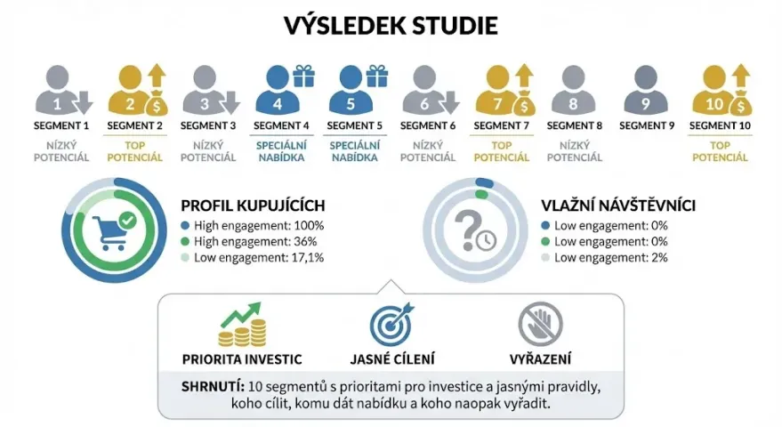 Výstupem bylo 10 segmentů s prioritami pro investice a jasnými pravidly na koho cílit, komu dát nabídku a koho naopak vyřadit.
